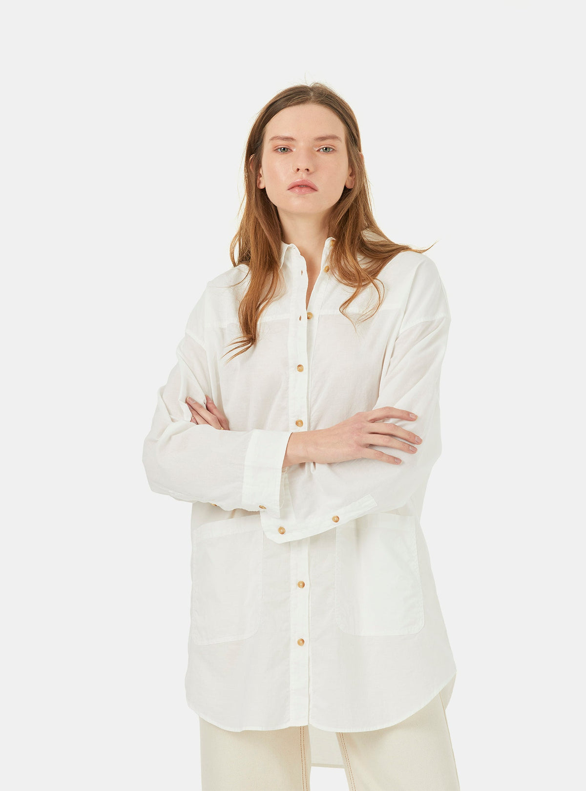 THE OUTLET hasta -70% Camisa de corte oversize con ligera transparencia matt gracias al voile de algodón ligero y fresco. Perfecta para utilizar con capas debajo y styling, ya que se puede usar como camisola de playa así como para combinar con unos vaqueros. Los botones se han elegido cuidadosamente de colecciones antiguas y finales de stock, lo que concede a cada prenda un carácter único y exclusivo. Tiene dos bolsillos y tapeta con un pespunte en zigzag. El canesú es alargado, acentuando la estética elegante, los hombros caídos y el detalle del pliegue en el centro de la espalda.